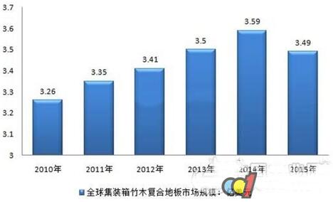 集装箱竹木复合地板是指以竹材作为面层材料,人工林木材旋切的单板作为芯层材料,经过合理的组坯和工艺制成的板材。集装箱底板必须具有良好的抗震、耐冲击、耐气候、耐老化等性能,除了外观尺寸之外,对集装箱底板用胶合板的胶合耐久性、静曲强度、弹性模量等物理力学性能提出了很高的要求,是迄今为止结构用人造板产品中技术性能要求最高的一种。 集装箱底板是集装箱的重要组成部分和主要承载配件,因为底板会影响到货物的运输安全和质量,因此也是人们关注的焦点之一。传统的底板主要采用印尼、马来西亚等地产的阿必通(Apitong)、克隆(Kerning)等热带硬阔叶材制造的厚度为28mm的19层木质胶合板。由于世界热带阔叶木材资源的减少和环保措施的实施,使得上述集装箱底板用的原料受到限制。因此,逐步采用替代材料,减少热带阔叶木材的使用量,将是今后集装箱底板发展的必然趋势。 20世纪50年代中期,美国近海沿岸运输中开始使用集装箱船,70年代开始,国际货运集装箱化迅速发展。作为集装箱必要配件的集装箱底板,其需求量与集装箱的发展几乎是同步的,但是其更新速度较慢,基本上是从单一树种的硬木实木底板改进为硬木胶合板底板。1993年,马来西亚公布了限制砍伐热带雨林政策,从而在世界范围内掀起了研制开发集装箱底板替代材料的热潮,出现了不同类型的底板。 2010-2015年全球集装箱竹木地板市场规模走势图(亿美元)