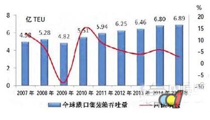 2016 年全球经济形势或将出现触底回暖,世界经济增速约扩张0.3% 至3.4% ;发达国家增速约提高0.2% 至2.1% ;发展中国家增速约加速0.3% 至4.3% ;国际贸易量回升至2014 年3.4% 的增速;全球海运量继续呈现平稳态势,预计增速为2.5%。 2015 年,全球港口集装箱吞吐量同比增长1.3% 至6.89 亿TEU,增速较上年下降4 个百分点,除2009 年(增速为-8.7%)以外,2015年增速为1980 年以来的最低水平。 2007 年—2015 年全球港口集装箱吞吐量及增长率